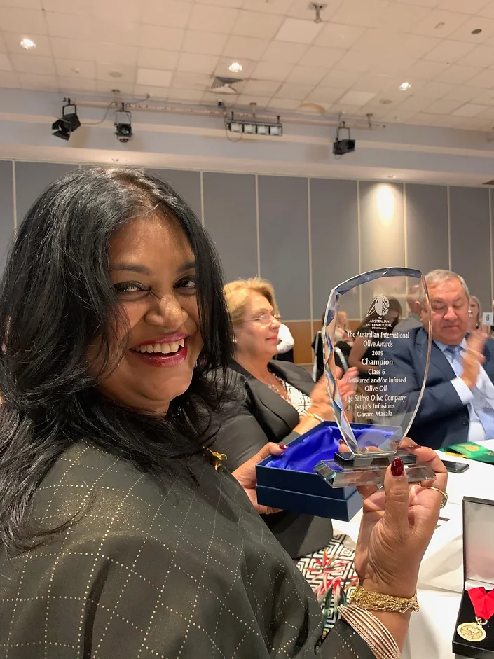 It was wonderful to be presented the trophy for Best Commercial WA Extra Virgin Olive Oil of Show by major sponsor Mr Fred Fairthorne from Farmer Jacks. The West Australian Olive Industry is honoured by the generous contribution of $10,000 from Mr Andrew Forrest of Minderoo Foundation. His support of the West Australian Agriculture Industry is greatly appreciated. Tanuja Sanders travelled to Albury to attend the 2019 Australian International Olive Awards on Friday 18th October. It was wonderful to share an evening other olive industry professionals and celebrate the industries achievements. Tanuja accepted 5 awards for The Sathya Olive Company including: